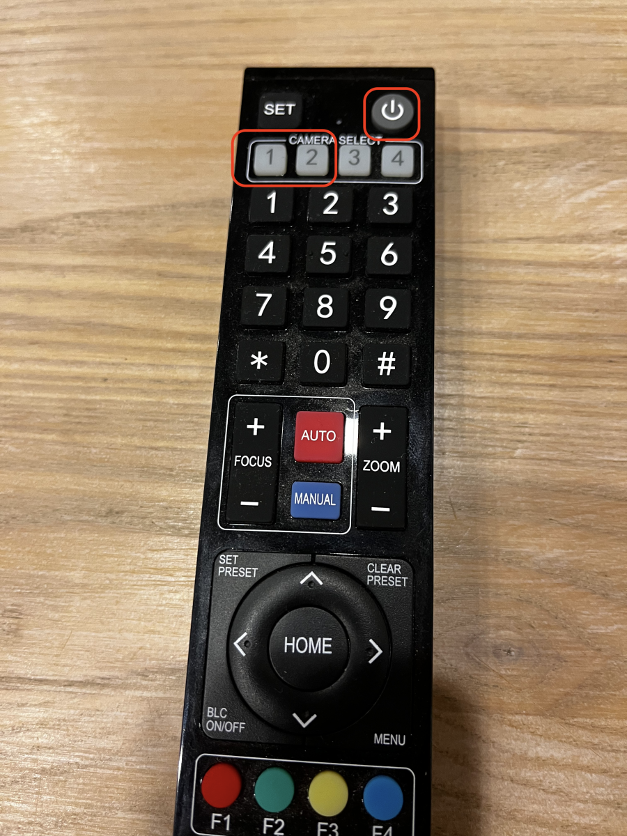 Gör sedan samma sak med den andra kameran, tryck på ”2” längst upp på fjärrkontrollen, och sedan på Standbyknappen. Rikta samtidigt fjärrkontrollen mot kameran ovanför mixerbordet. När kameran är startad kommer den snurra runt och riktas rakt fram.