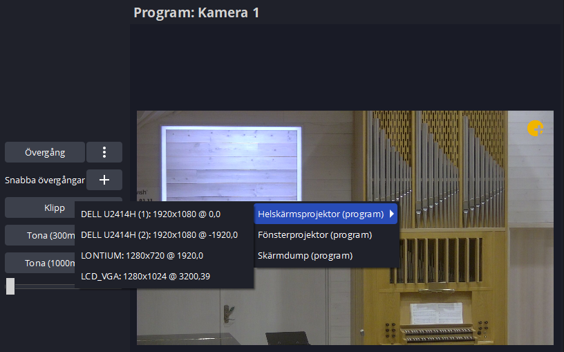 I den högra videorutan i OBS, högerklicka och välj ”Helskärmsprojektor (program)” > Lontium. Samma bild som visas i denna videorutan ska nu visas på båda TV-skärmarna.
