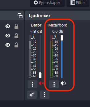 Dubbelkolla att ljudet är på. Högtalarknappen ska vara vit och inte röd med ett kryss under den kanal som heter ”Mixerbord”.