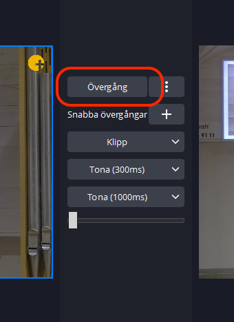 Välj ”Kamera 1” eller ”Kamera 2” i listan över scener till vänster i OBS. När text från Proclaim ska visas välj ”Kamera 1 Projektor” eller ”Kamera 2 Projektor”. Vald scen förhandsvisas i den vänstra videorutan. För att använda den valda och köra ut i sändningen tryck på ”Övergång” mellan videorutorna. Du ser nu den valda scenen i videorutan till höger. Den högre videorutan är alltid det som visas på skärmarna och i webbsändningen.