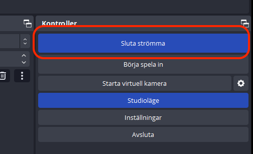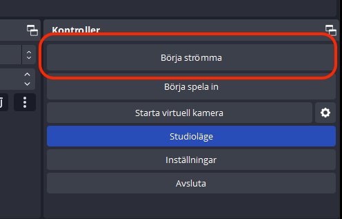 Nu är allt redo för att starta sändningen. Detta görs genom att trycka på ”Börja strömma” till höger i OBS. Knappen är blå när sändningen är igång.