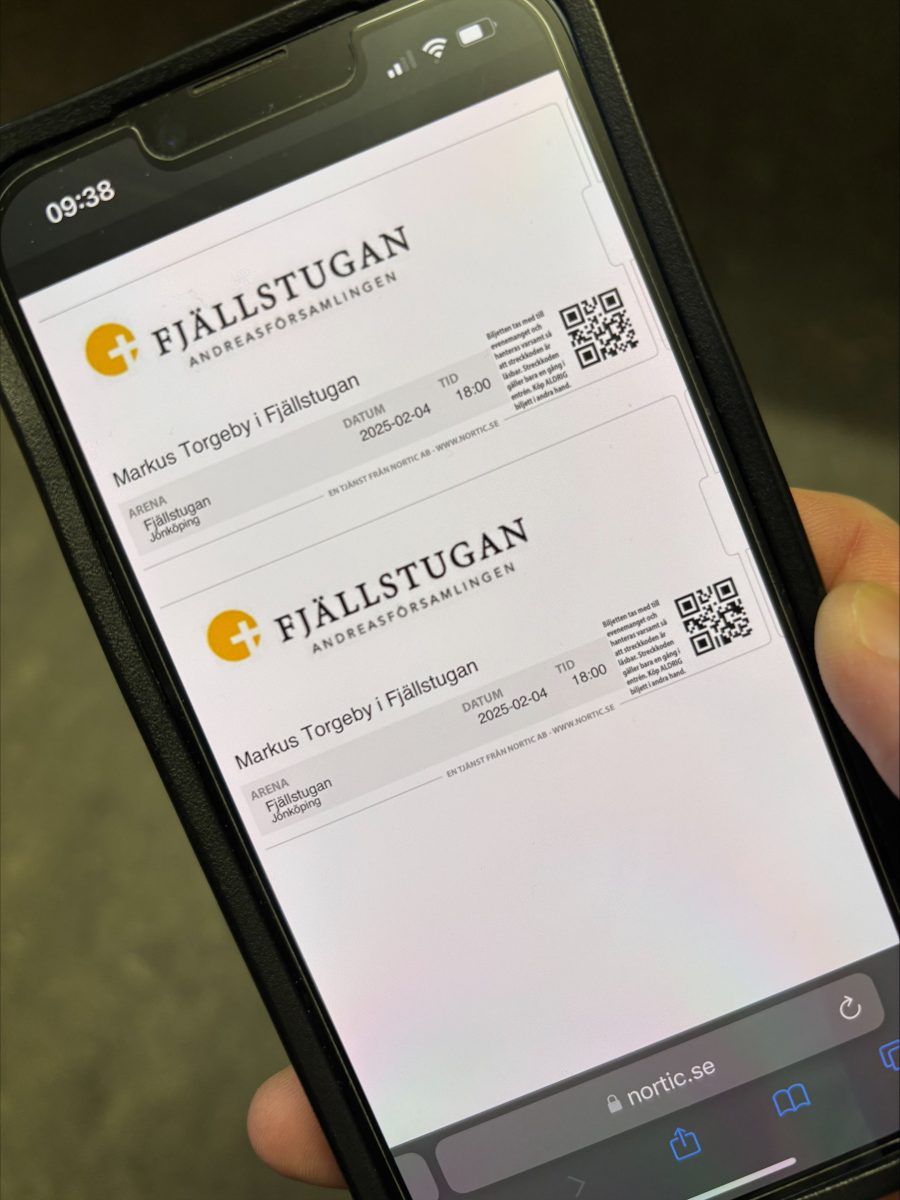 Dina biljetter har en QR-kod som vi kommer scanna vid insläppet. Visa gärna biljetten på din telefon (se bilden nedan), och det går även bra att ha med sig utskrift på papper. Vi kan inte scanna ditt bekräftelsemail eller kvitto, utan det är biljetterna med QR-kod som gäller. Skulle du ha glömt dina biljetter så säg till vid biljettinsläppet så söker vi upp din beställning i datorn, men det tar då extra tid att hantera.
